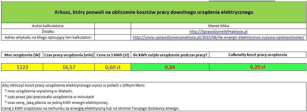 Aby wyliczyć koszt jednego, prawie 17-to minutowego cyklu pracy odkurzacza skorzystałem z kalkulatora, który opisałem już we wpisie dotyczącym kosztów pracy opiekacza/tostera. Kalkulator ten możesz otrzymać zupełnie za darmo, jeśli tylko zapiszesz się na newsletter mojego bloga.
