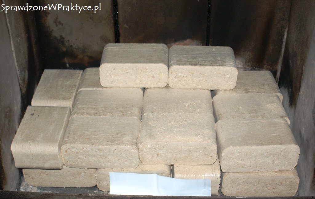 Brykiet ułożyłem ściśle, jedna kostka koło drugiej. Im mniej miejsca między kostkami brykietu, tym dłużej brykiet będzie się palił, albo raczej żarzył.