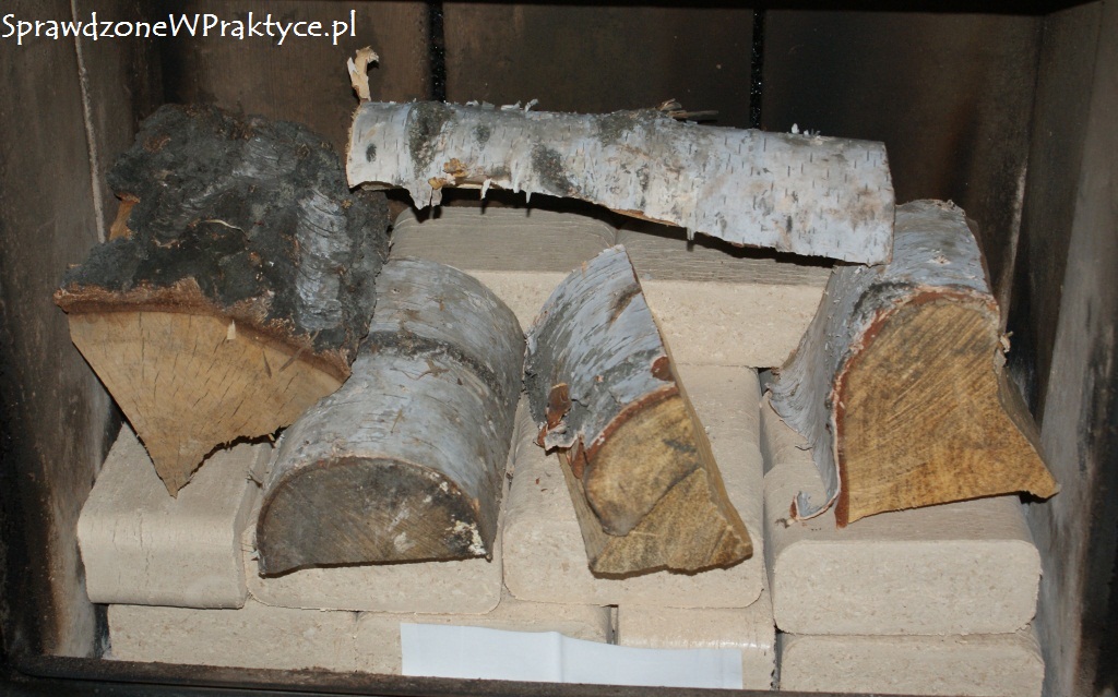 Na brykiet ułożyłem kilka kawałków drewna. Przy temperaturze poniżej minus 10 stopni na zewnątrz drewna byłoby więcej. Ale jeśli na zewnątrz mamy 10 stopni, to nie ma sensu ostro grzać.