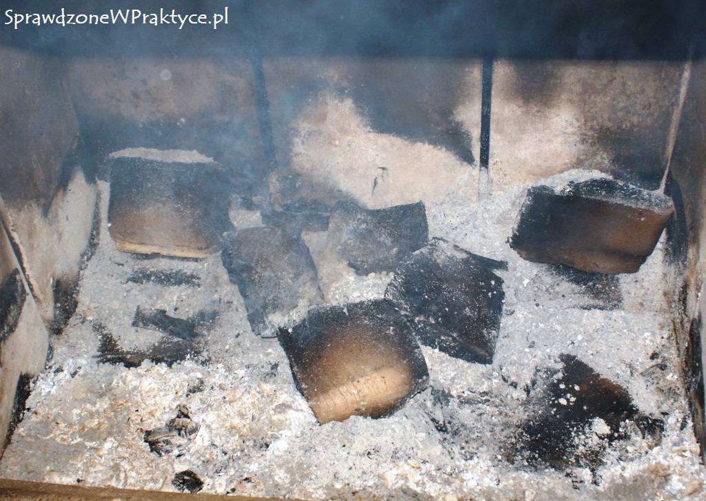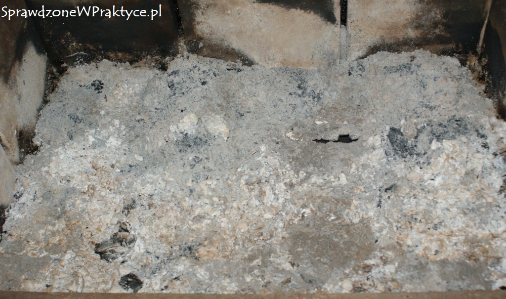 Kolejnego dnia, po 12:00 sprawdziłem co tam słychać w kominku. Tak jak myślałem, w komorze kominka był nadal ciepło. Niewielka ilość białego popiołu, a w nim w dalszym ciągu palące się kostki brykietu.