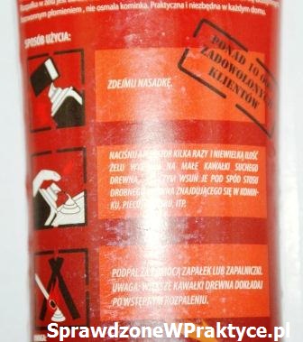 Na dołączonej ulotce mamy instrukcję rozpalania z wykorzystaniem tej rozpałki. Wystarczy posmarować kawałek drewienka, podpalić go i włożyć w stos suchych kawałków drobnego drewna rozpałkowego. Proste.
