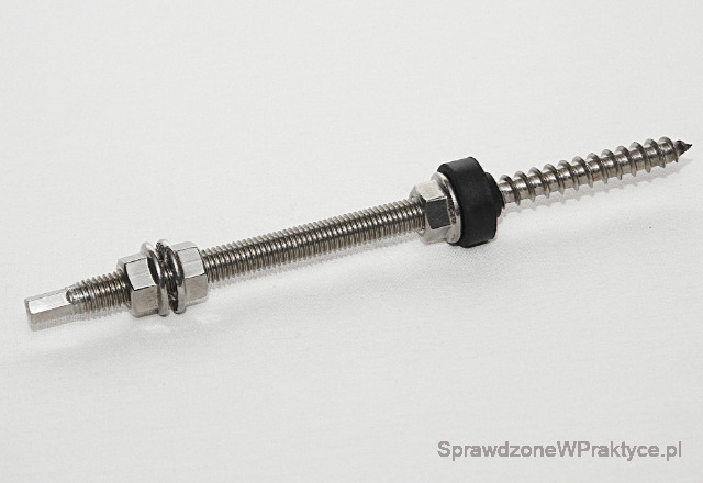 Jeśli mamy dach pokryty blacho dachówką, to konstrukcję pod panele fotowoltaiczne musimy do niego przytwierdzić za pomocą śrub dwugwintowych. Z jednej strony śruba ma gwint, który pozwala na wkręcenie jej do krokwi dachowej a z drugiej ma inny gwint i nakrętki, które służą do montażu profili aluminiowych konstrukcji. Ma też uszczelkę EPDM, która uszczelnia otwór, który musimy wywiercić w blacho dachówce. Najpierw, na dachu musimy zlokalizować, gdzie są poprowadzone krokwie dachowe. Później nad nimi przewiercić się przez blacho dachówkę wiertłem do metalu. Kolejny krok to wywiercenie w krokwi cienkim, długim wiertłem do drewna otworu prowadzącego dla śruby. Następnie wkręcamy w otwór śrubę, dokręcamy nakrętką uszczelkę EPDM tak, żeby przez wykonany otwór nie przeciekała woda. Teraz, do tak przygotowanej śruby możemy przykręcić adaptery montażowe i profile aluminiowe. Montaż konstrukcji na dachu pokrytym blacho dachówką jest według mnie najbardziej wymagający i żeby wszystkie połączenia konstrukcji z dachem były szczelne, monterzy muszą wykazać się dokładnością i precyzją podczas montażu.