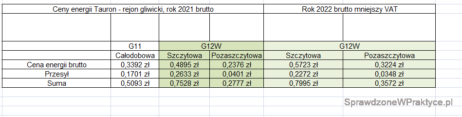 Nasz sprzedawca energii to Tauron. Korzystamy z taryfy G12w. Korzystamy z zasad rozliczania produkcji energii elektrycznej z fotowoltaiki z systemu Prosument.