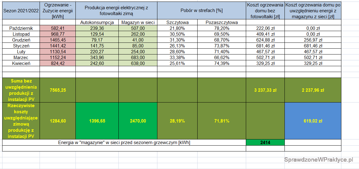 Ogrzewanie elektryczne domu (COP=1) i fotowoltaika, podsumowanie kosztów za sezon 2021/2022