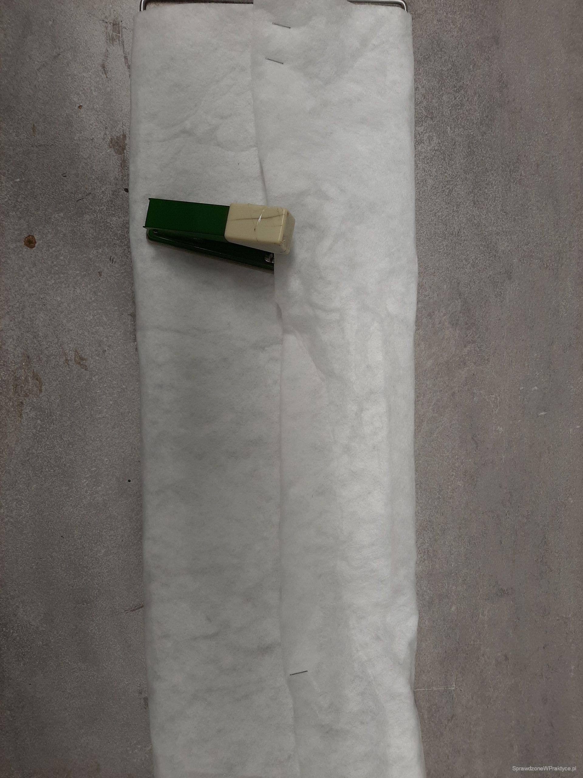Kolejny krok to zagięcie tkaniny wokół ramki filtra i zszycie. Ja idę na zupełną łatwiznę i zszywam tkaninę zszywaczem biurowym. Musze tylko pilnować, żeby wszystkie zszywki solidnie się zacisnęły i nie została żadna luźna, która mogłaby uszkodzić wymiennik ciepła w rekuperatorze.